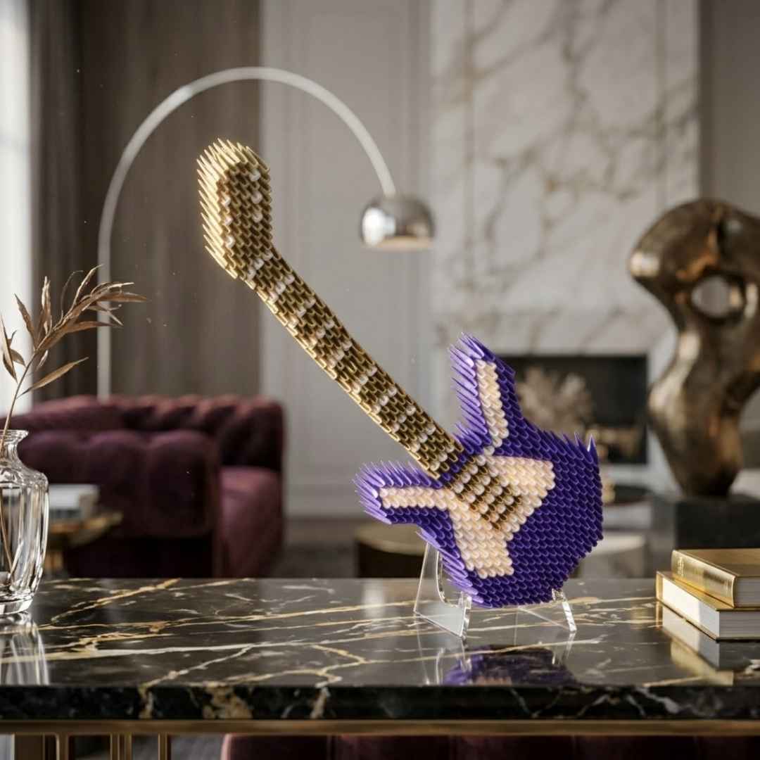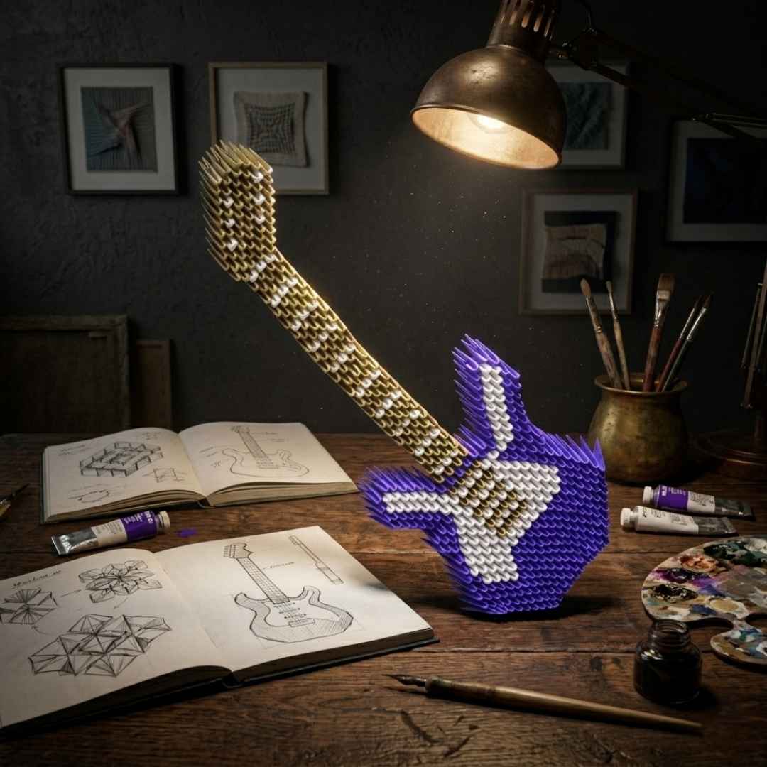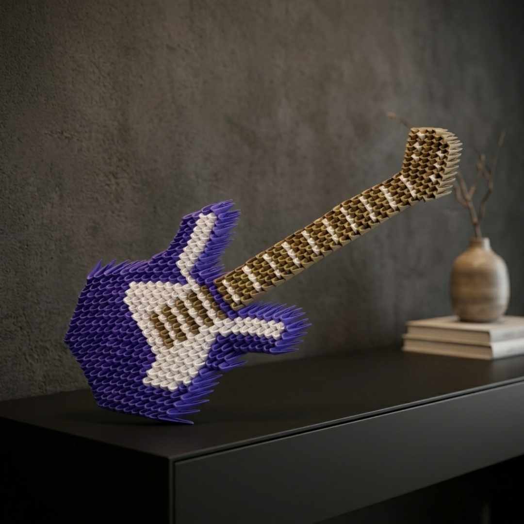 Each sculpture is assembled from hundreds of individually folded paper modules that are carefully interlocked to form a detailed three-dimensional guitar. The geometric structure, layered design, and precise folding reflect the patience and skill required in traditional origami craftsmanship.