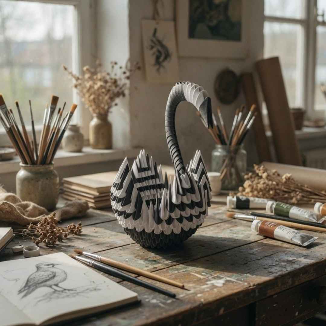 Each swan is constructed from hundreds of individually folded paper units, carefully connected to create a detailed and symmetrical structure. The layered wings, curved neck, and textured body reflect the patience and precision behind traditional origami craftsmanship, turning paper into a remarkable decorative artwork.